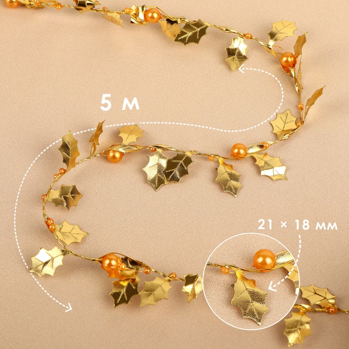 Листья на металлической проволоке, с бусинами, 21 × 18 мм, 5 м, цвет золотой