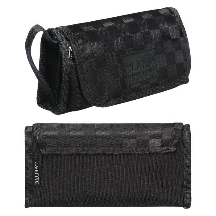 Пенал "deVENTE. TOTAL BLACK" 21x10x7,5 см, прямоугольный для 60 предметов, с верхней створкой на липучке, текстильный, на молнии, наружный объемный карман на молнии, отделение с органайзером, с аппликацией из каучука, с ручкой-петлей.