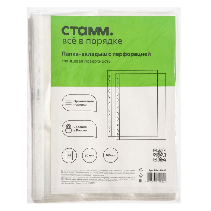 Файл-вкладыш А4 60мкм СТАММ, вертикальный, глянцевая, 100 штук