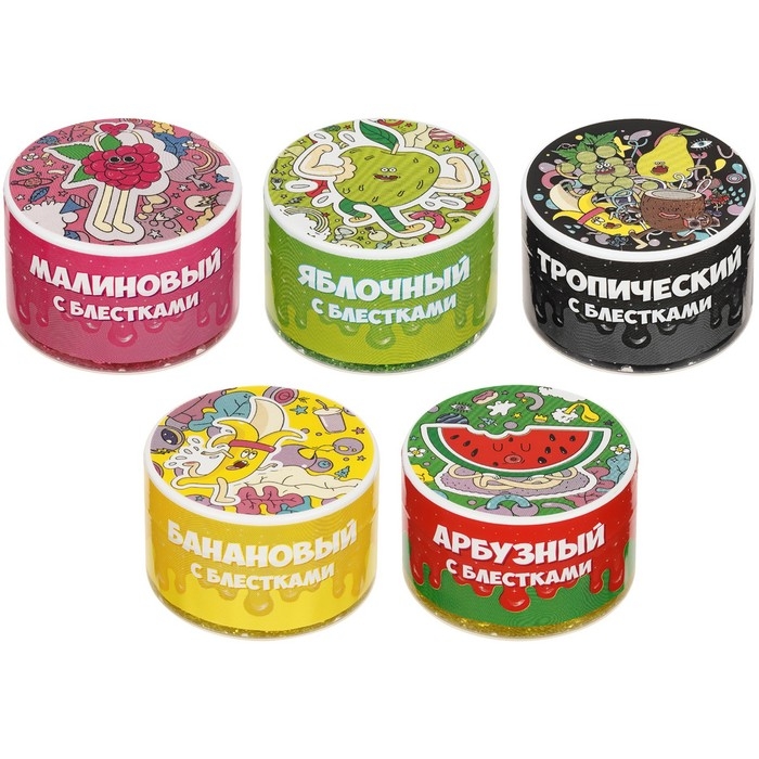 - Слаймы упакованы в красочные баночки, которые удобно хранить и брать с собой.