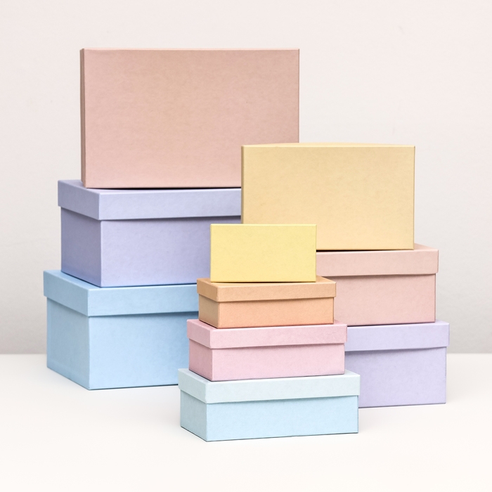 Набор из 10 коробок в нежных оттенках - это идеальное решение для хранения и транспортировки различных предметов, начиная от ювелирных изделий и заканчивая подарками.