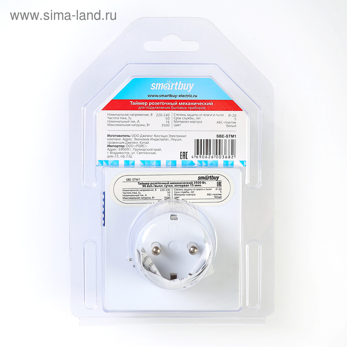 Таймер розеточный Smartbuy, механический, 3500 Вт, 96 вкл./выкл. сутки, интервал 15 мин