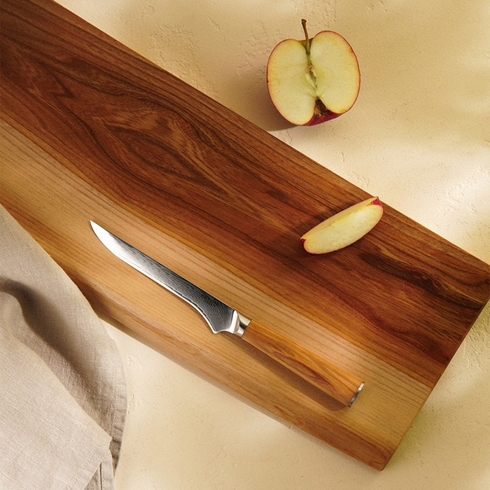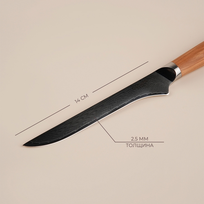 Этот изысканный обвалочный нож из серии «Оливия» от SL Home станет истинным украшением вашей кухни. С его помощью процесс разделки мяса превращается в настоящее искусство. Лезвие длиной 14 см изготовлено из прочной дамасской стали, которая славится своей долговечностью и превосходными режущими свойствами. Эта сталь не только устойчива к коррозии, но и сохраняет остроту в течение длительного времени, что делает нож идеальным выбором для ежедневного использования.