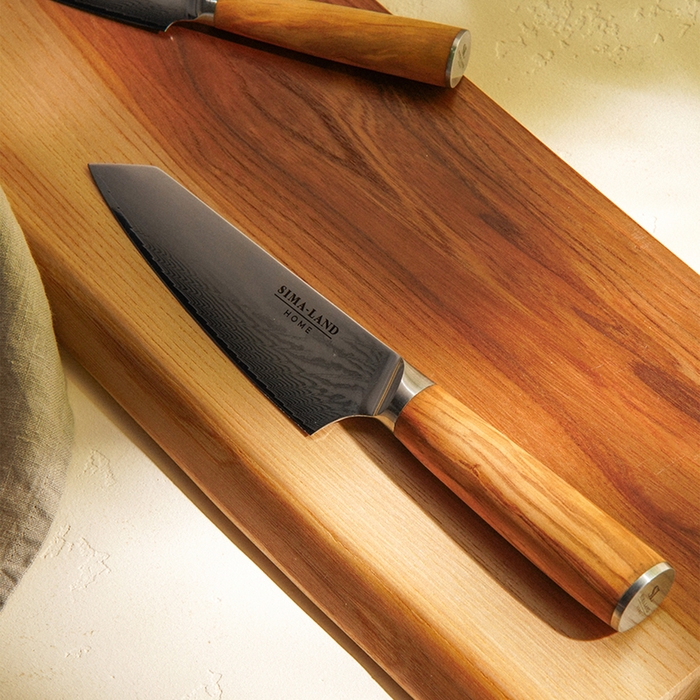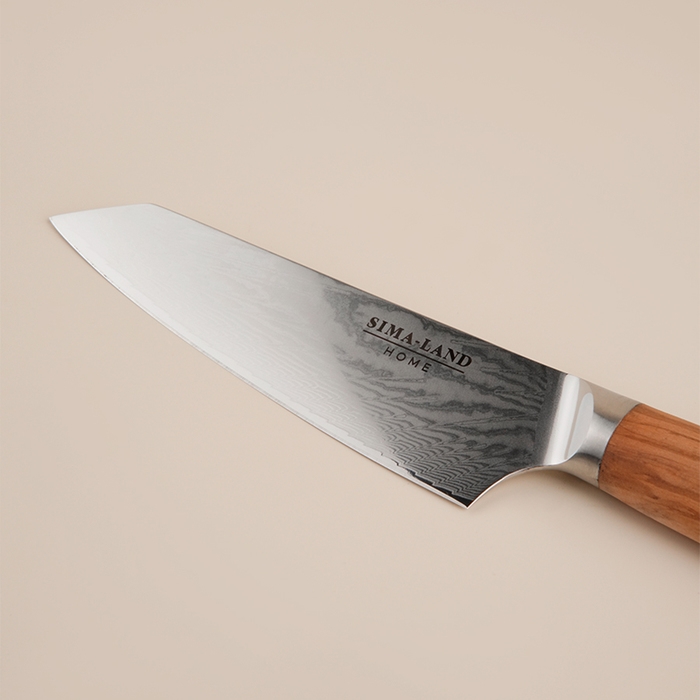 Лезвие длиной 16 см изготовлено из прочной дамасской стали, что обеспечивает не только исключительную остроту, но и долговечность ножа. Материал устойчив к коррозии, что гарантирует продолжительный срок службы даже при ежедневном использовании. Эргономичная ручка из дерева удобно ложится в руку, обеспечивая уверенное управление и снижая усталость во время работы.