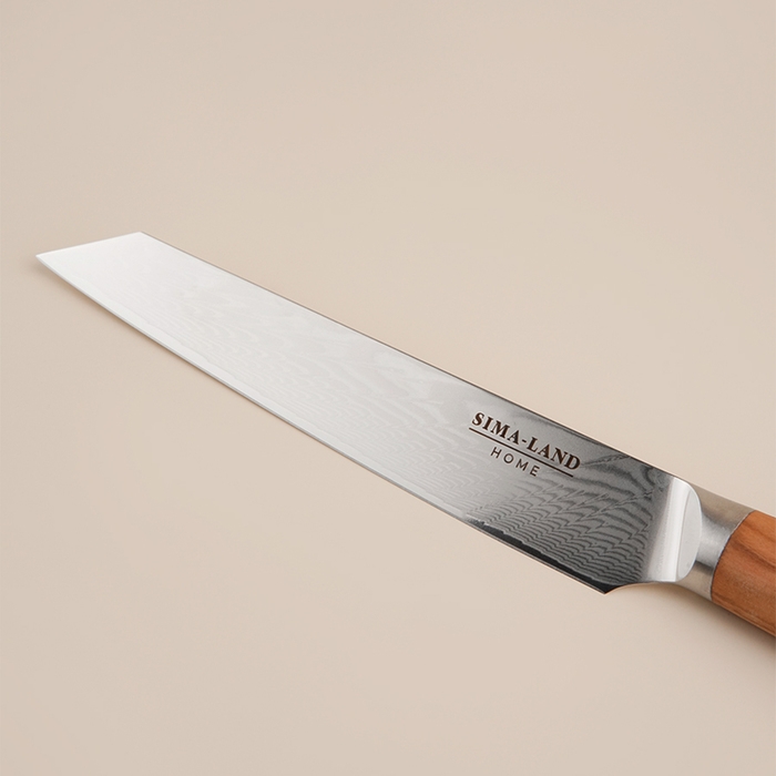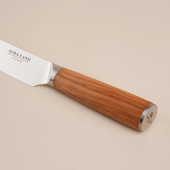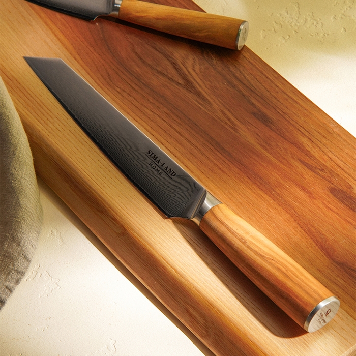 - Удобство использования: Эргономичная деревянная ручка не только комфортно ложится в руку, но и придаёт ножу стильный и натуральный внешний вид. Она не скользит и отлично управляется, что особенно важно при длительном использовании.