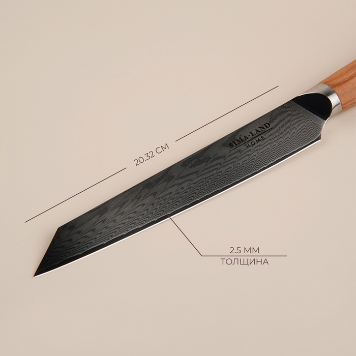 Кухонный нож изготавливается из дамасской стали, что придаёт его лезвию исключительную прочность и остроту. Длина лезвия 20,32 см делает его идеальным для самых разнообразных задач на кухне, от тонкой нарезки до разделки крупных кусков мяса или рыбы. Нержавеющая сталь защищает лезвие от коррозии, что гарантирует его долговечность и стабильное качество нарезки на протяжении многих лет.