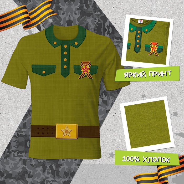Карнавальный набор для юного солдата включает футболку и пилотку, которые подойдут для создания образа защитника на детских праздниках или тематических мероприятиях. Футболка изготовлена из 100% хлопка, что обеспечивает комфорт и безопасность при носке, а яркий принт добавляет изделию реалистичности.
