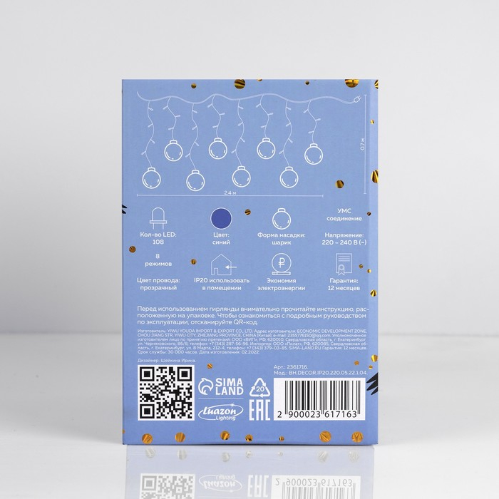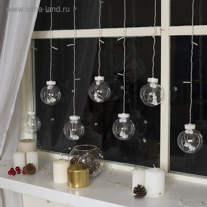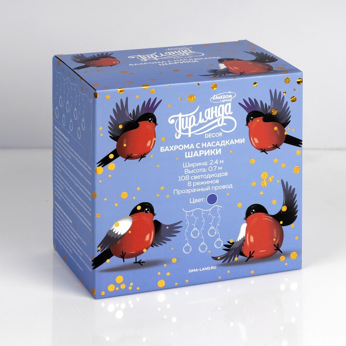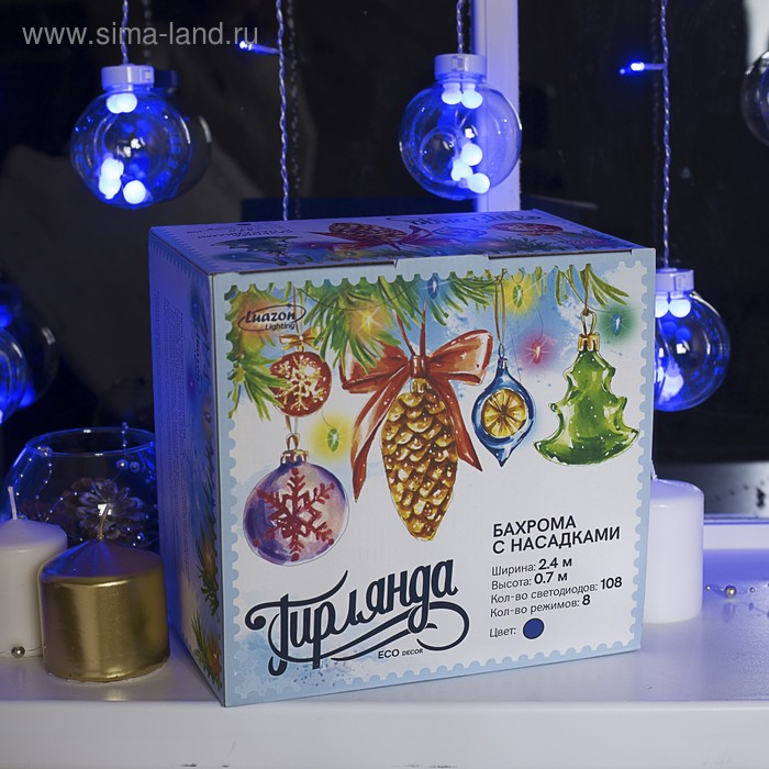 Гирлянда «Бахрома» 2.4 × 0.7 м с насадками «Шарики», IP20, прозрачная нить, 108 LED, свечение синее, 8 режимов, 220 В