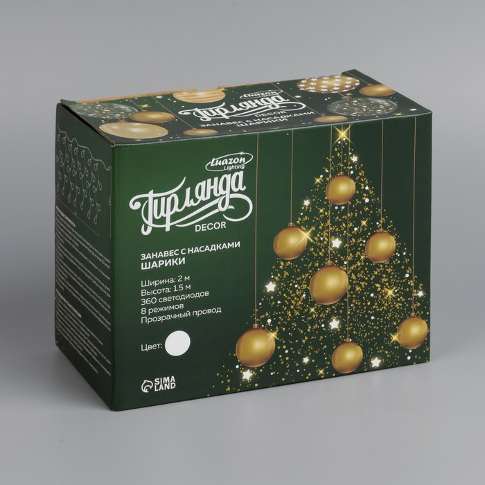 Гирлянда «Занавес» 2 × 1.5 м с насадками «Шарики», IP20, прозрачная нить, 360 LED, свечение белое, 8 режимов, 220 В