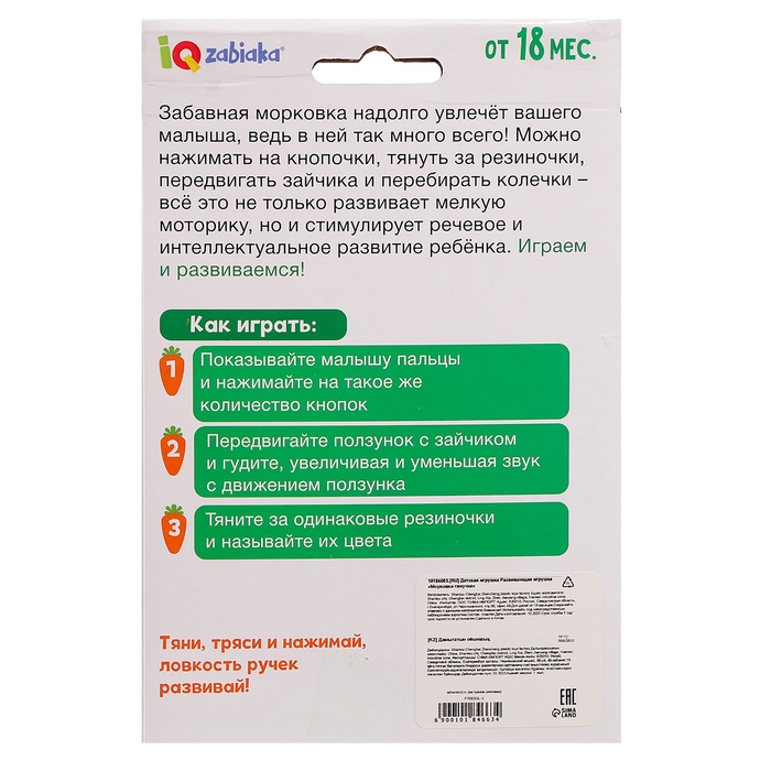 Развивающая игрушка «Морковка-тянучка» разработана специально для малышей от 18 месяцев. С такой игрушкой ребёнок потренирует сенсорное восприятие, мелкую моторику, координацию движений и логическое мышление.