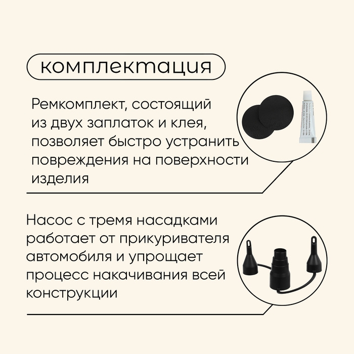- Насос с тремя насадками работает от прикуривателя автомобиля и упрощает процесс накачивания всей конструкции.