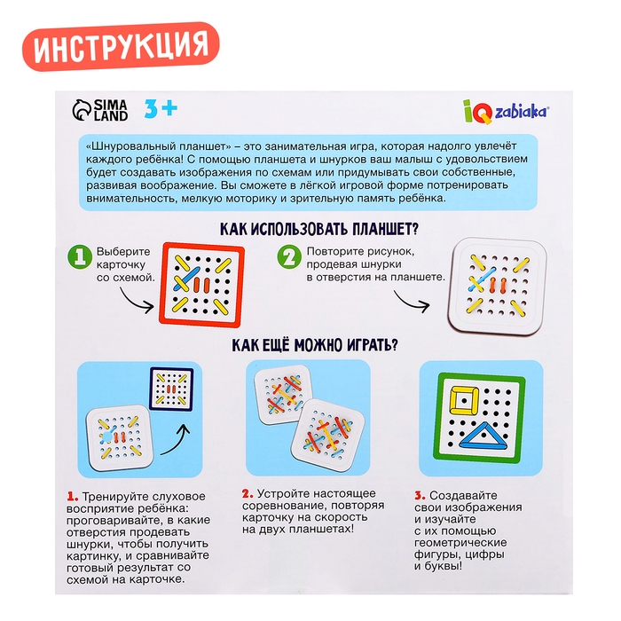 Развивающий набор «Шнуровальный планшет» поможет в лёгкой игровой форме потренировать внимательность, моторику и зрительную память ребёнка. С помощью планшета и шнурков малыш сможет создавать изображения по схемам или придумывать свои собственные, развивая воображение.