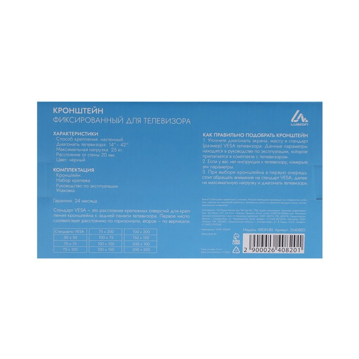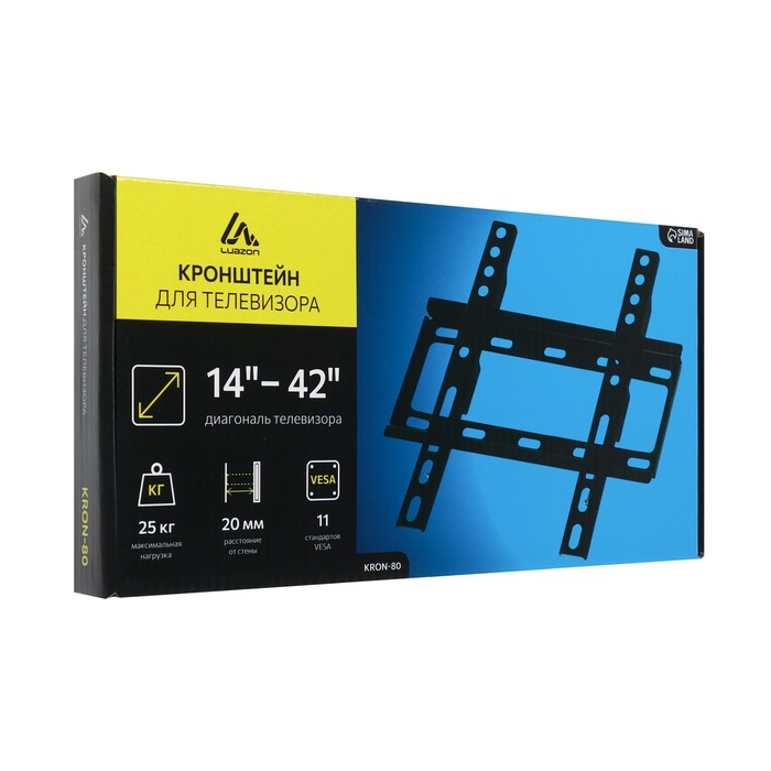 Кронштейн Luazon KrON-80, для ТВ, фиксированный, 14-42", 20 мм от стены, черный