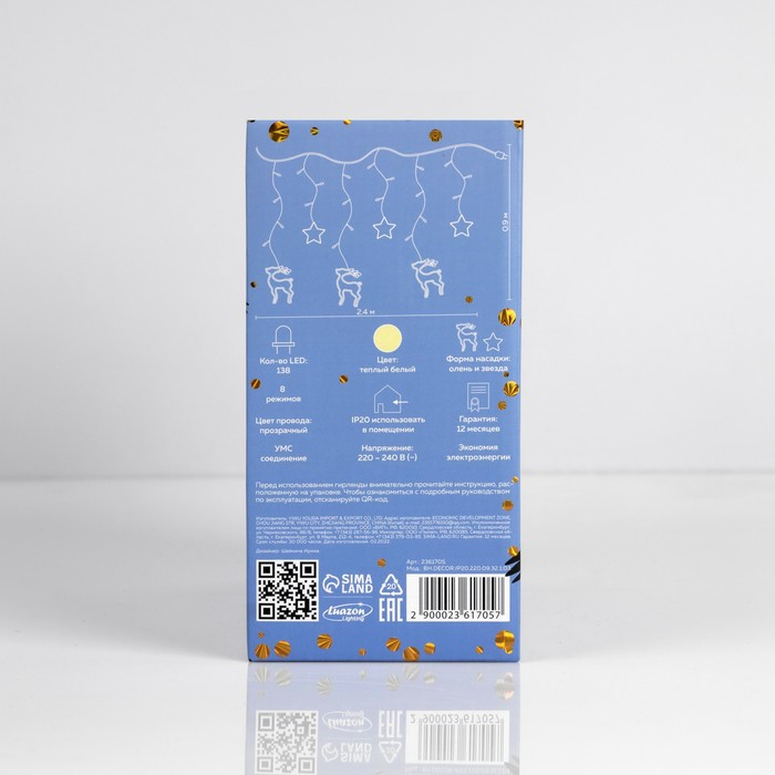 Гирлянда «Бахрома» 2.4 × 0.9 м с насадками «Олень», IP20, прозрачная нить, 138 LED, свечение тёплое белое, 8 режимов, 220 В