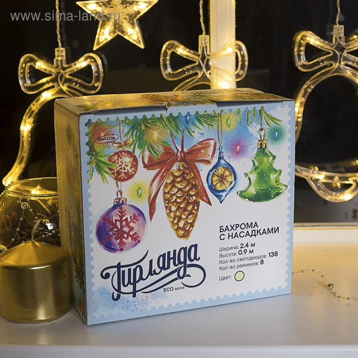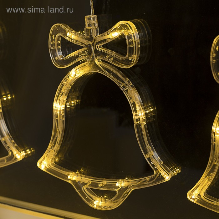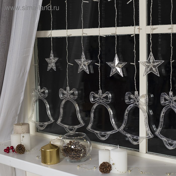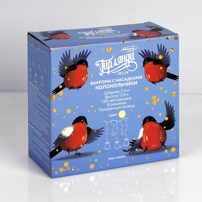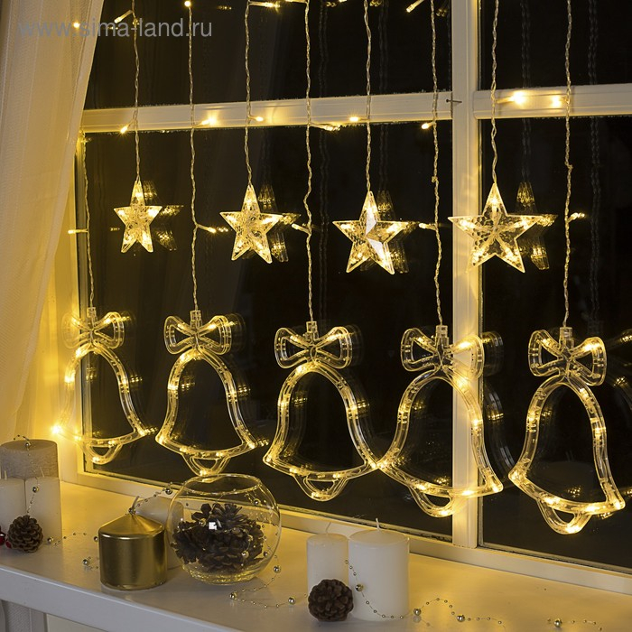 Гирлянда «Бахрома» 2.4 × 0.9 м с насадками «Колокольчики», IP20, прозрачная нить, 138 LED, свечение тёплое белое, 8 режимов, 220 В