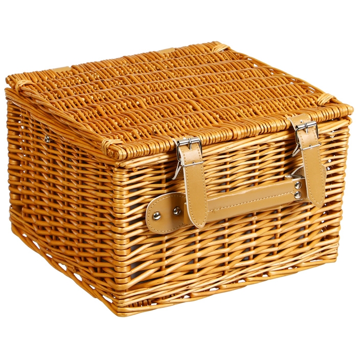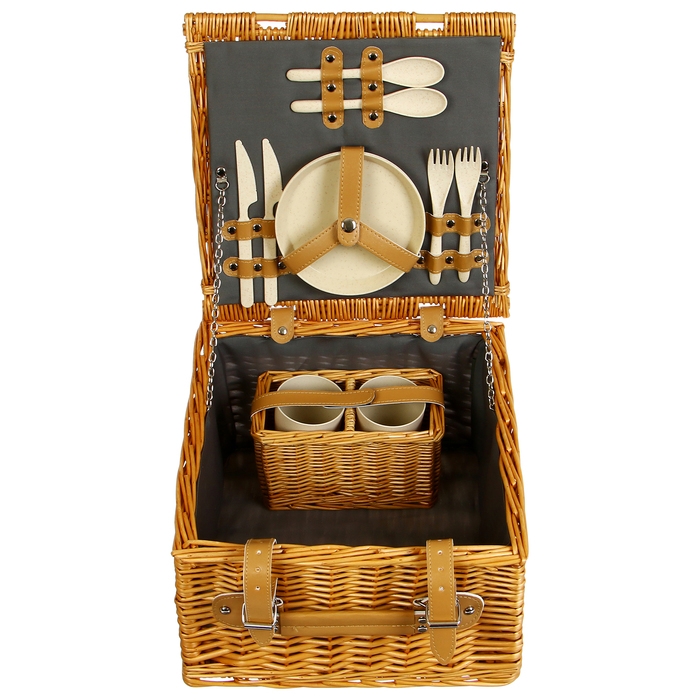 Корзина для пикника с посудой — компактный и функциональный набор для отдыха на природе. Изделие плотно фиксируется специальными ремешками. Корзина выполнена из натуральной лозы и имеет древесную текстуру.