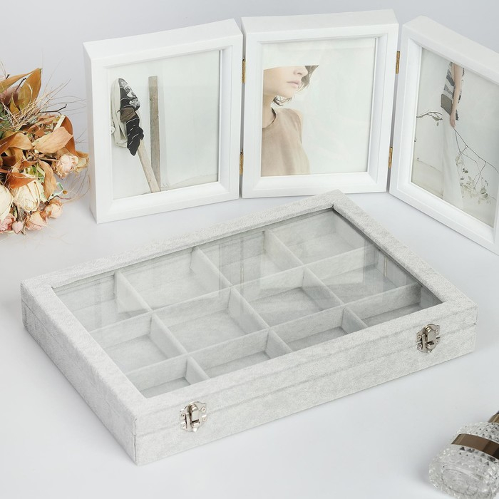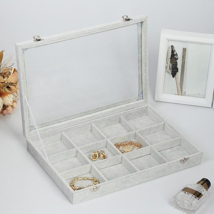 Подставка для украшений «Шкатулка» 12 ячеек, 35×24×4,5, стеклянная крышка, цвет серый