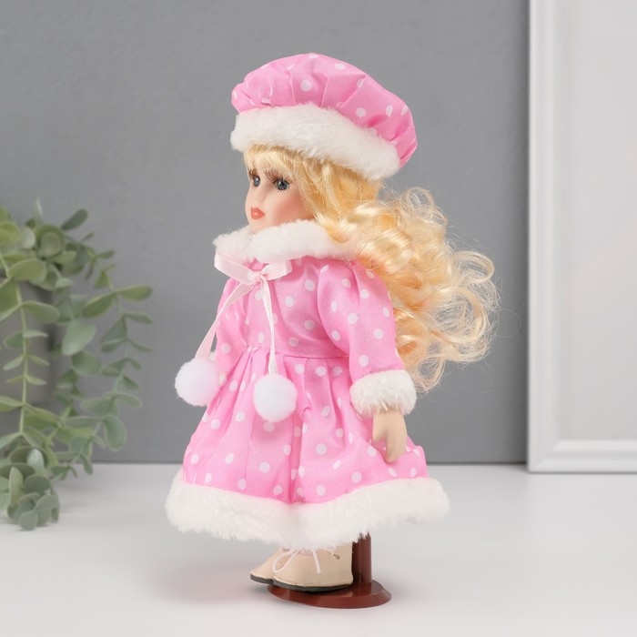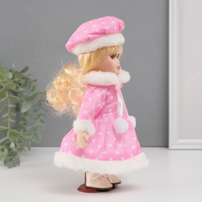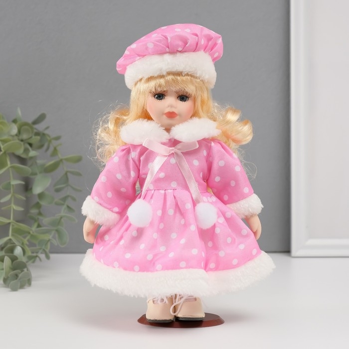 Кукла коллекционная керамика "Малышка Лиза в розовом платье в горох, с мехом" 21 см