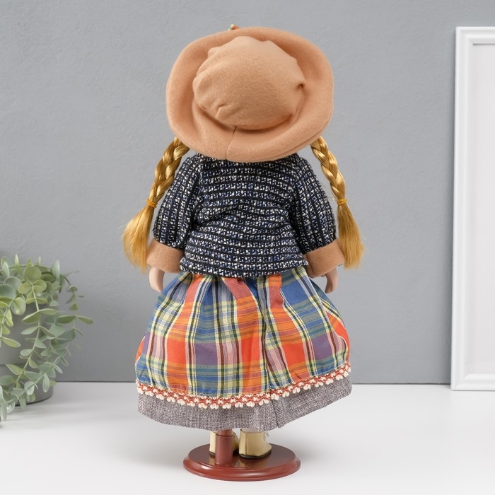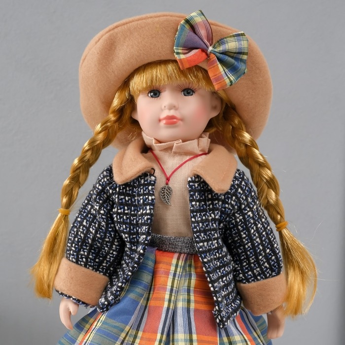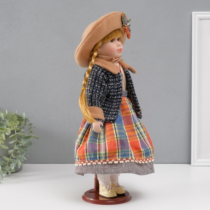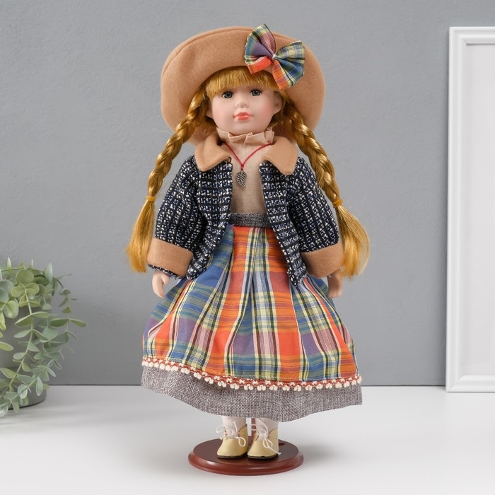 Кукла коллекционная керамика "Вика в клетчатой разноцветной юбке" 39 см