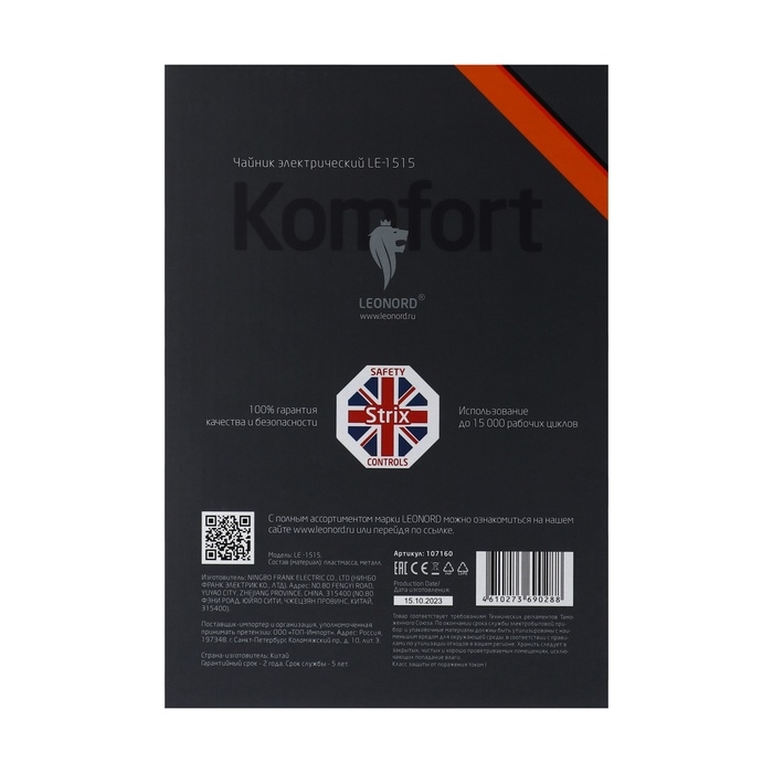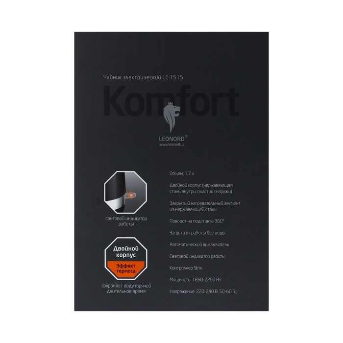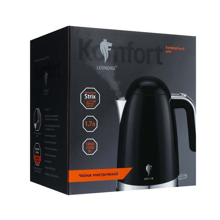 Чайник электрический Leonord LE-1515, пластик, колба металл, 1,7 л, 2200 Вт, чёрный