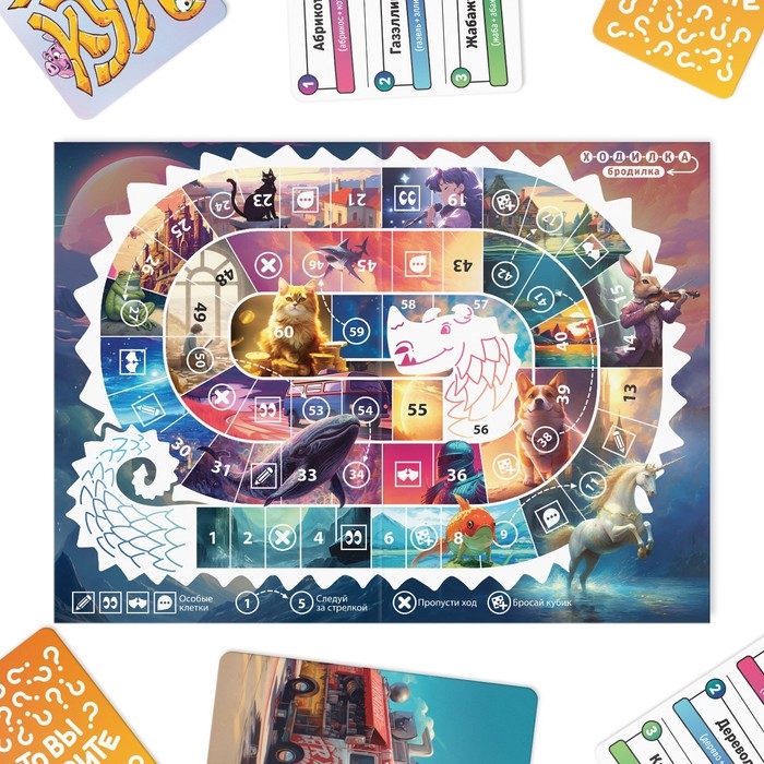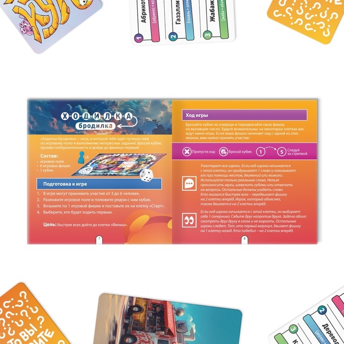 Кидайте кубик и передвигайтесь по игровому полю. А чтобы игра прошла ещё интереснее, вас ждут небольшие задания.