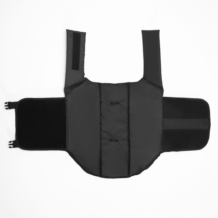 Жилет выполнен из качественных материалов: нейлон и пенополиэтилен, обеспечивает прочность и надежность жилета, крепеж из крепкого пластика не подвергается коррозии, что позволяет надежно зафиксировать жилет на собаке.