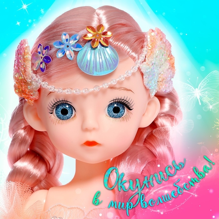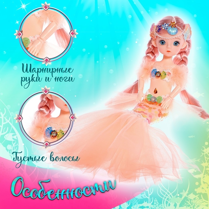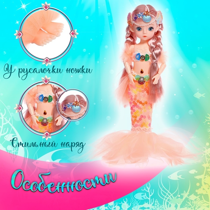 Кукла в образе русалки с оранжевыми оттенками станет отличным подарком для девочек. Высота игрушки составляет 45 см, что делает её удобной для игры и создания удивительных приключений.