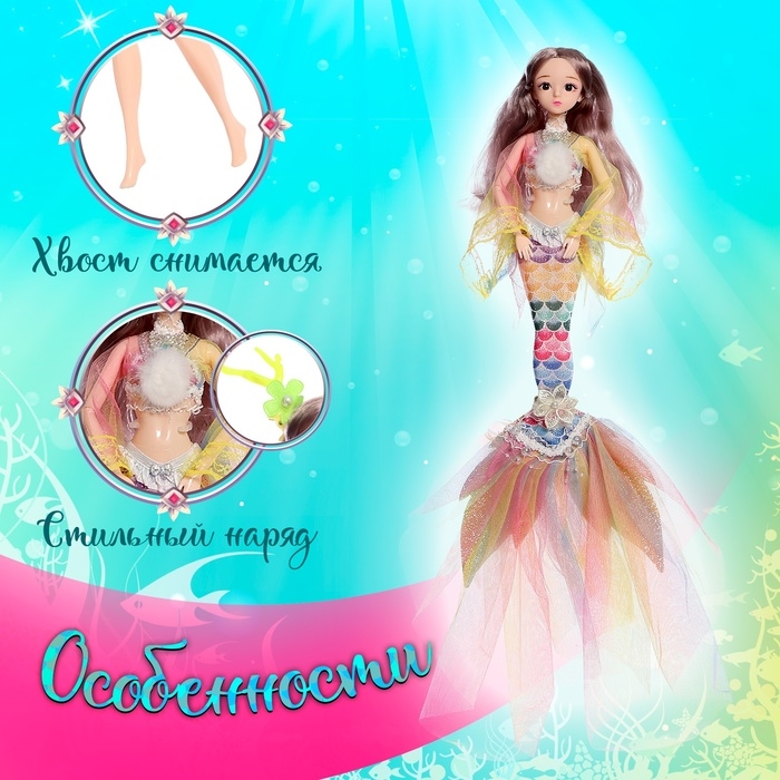 Кукла в образе русалки станет отличным подарком для девочек. Высота игрушки составляет 45 см, что делает её удобной для игры и создания удивительных приключений.