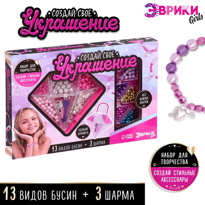 - Проявив фантазию, малышка сможет сочетать элементы набора с другими видами плетения, например соединить бисер с резиночками и получить уникальную бижутерию.