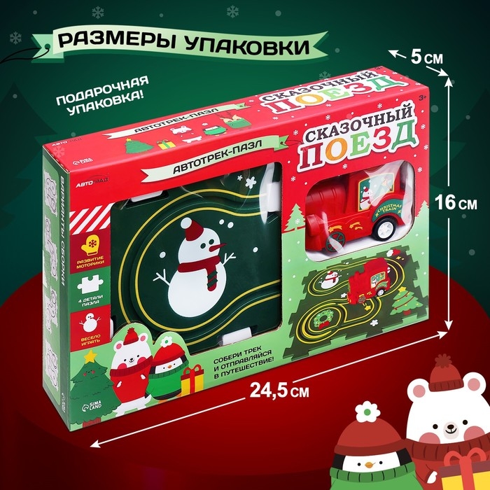 С трек-пазлом «Сказочный поезд» малыш отправится в новогодние приключения! Эта увлекательная развивающая игрушка предназначена для детей от 3 лет. «Сказочный поезд» не только подарит радость от весёлых игр, но и поможет развить важные навыки.