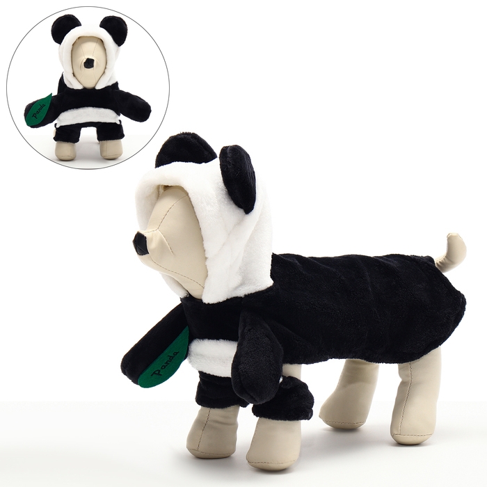 Костюм выполнен из качественного текстиля, что гарантирует его долговечность и удобство в носке. В нем отсутствуют застежки, что позволяет легко надевать и снимать костюм, не причиняя неудобств собаке. Дизайн костюма сочетает в себе черные и белые цвета, создавая забавный и милый образ панды.