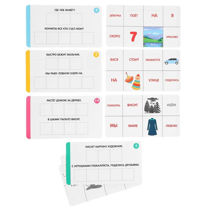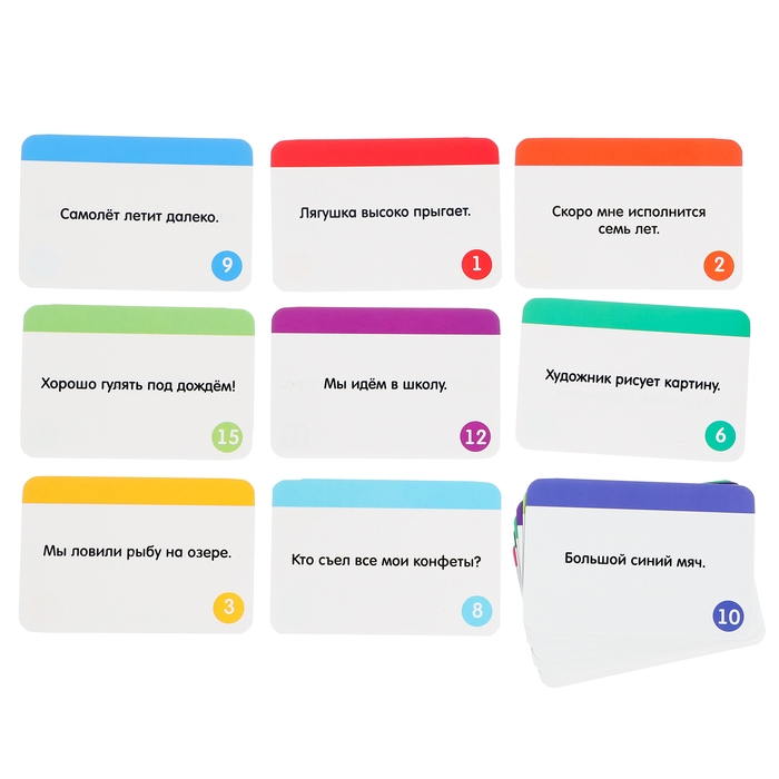 - Взрослый ведущий достаёт из колоды с предложениями карточку и зачитывает её. Сначала чётко проговаривает предложение, затем называет отдельные слова.
