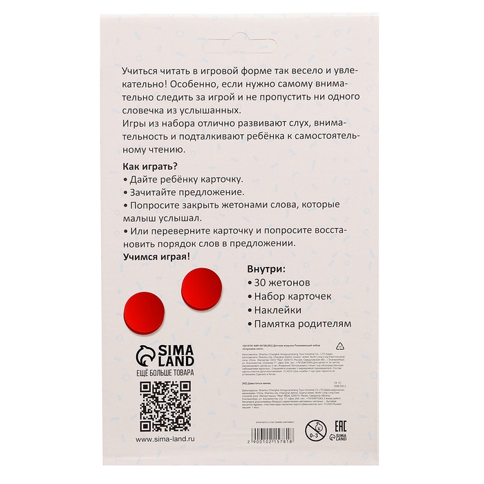 Развивающий набор «Слуховое лото» поможет малышам от 3 лет научиться читать и воспринимать информацию на слух, а также потренировать внимательность, логическое мышление и память.