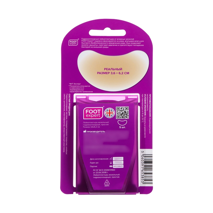 FOOT EXPERT – экспресс-решение при влажных мозолях. В состав пластыря входит гидроколлоидный полимер, состоящий из мельчайших частиц, которые образуют на поверхности тонкую пленку. При воздействии на пораженную кожу пленочка быстро впитывает отделяемую из раны жидкость, увлажняет поверхность кожи, хорошо пропускает воздух, не позволяет формироваться рубцам и корочкам при заживлении мозоли. Благодаря большому размеру пластырь содержит больше гидроколлоидной массы, чем другие пластыри, надёжнее защищая от трения. Оптимален для болезненных волдырей, например, вызванных спортивными занятиями.