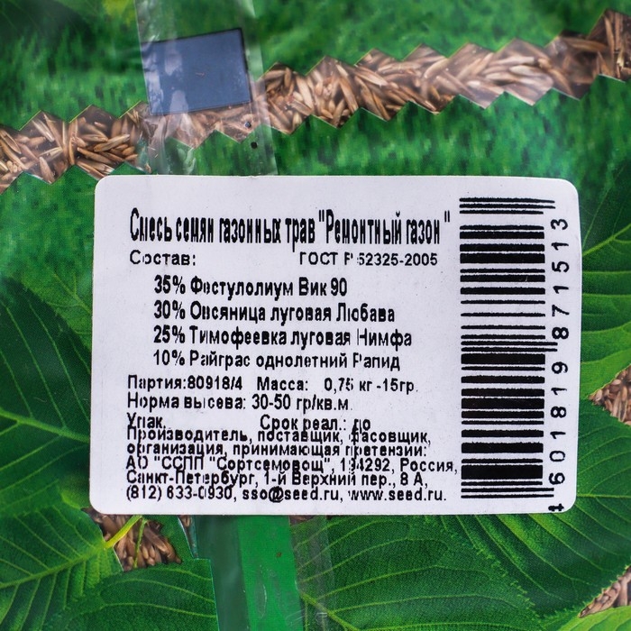 Семена газонной травы "Зеленый уголок","Ремонтный", 0,75 кг