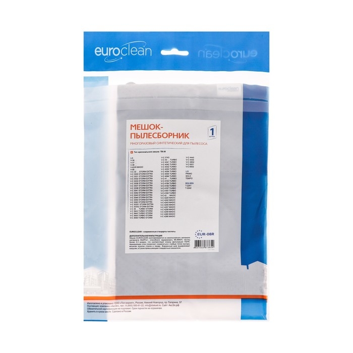 Мешок-пылесборник EUR-08R Euroclean — это многоразовое изделие, предназначенное для использования в пылесосах. Он изготовлен из прочного и долговечного материала, который обеспечивает эффективную фильтрацию воздуха от пыли и грязи.
