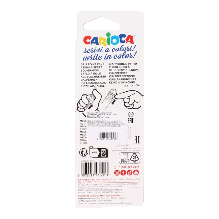 Ручка шариковая автоматическая, 10 цветов, "Carioca", узел 1.0 мм, стандартная палитра, микс