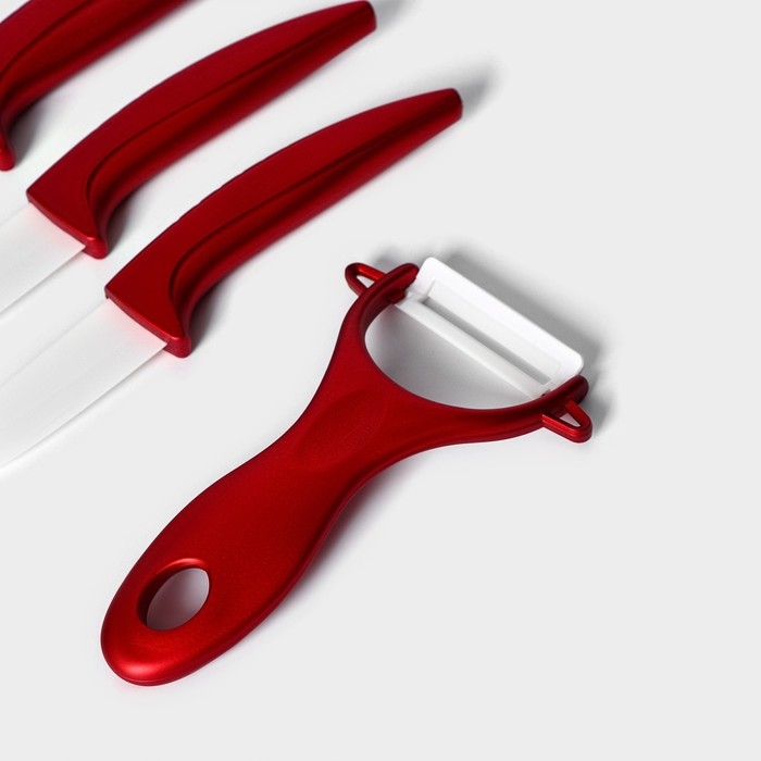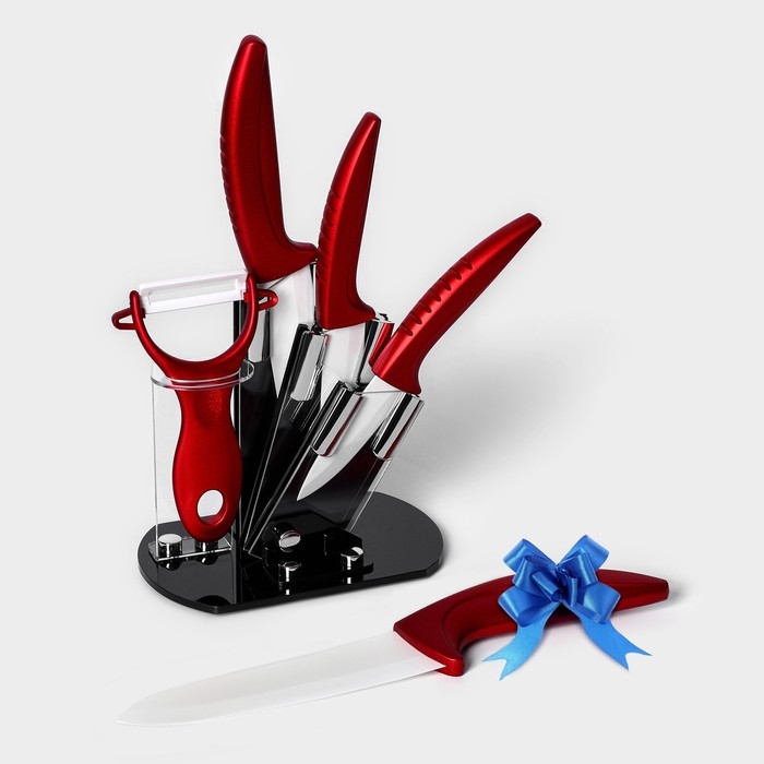 Набор кухонный на подставке «Изгиб», 4 предмета: 3 ножа, овощечистка, + нож в подарок, цвет красный