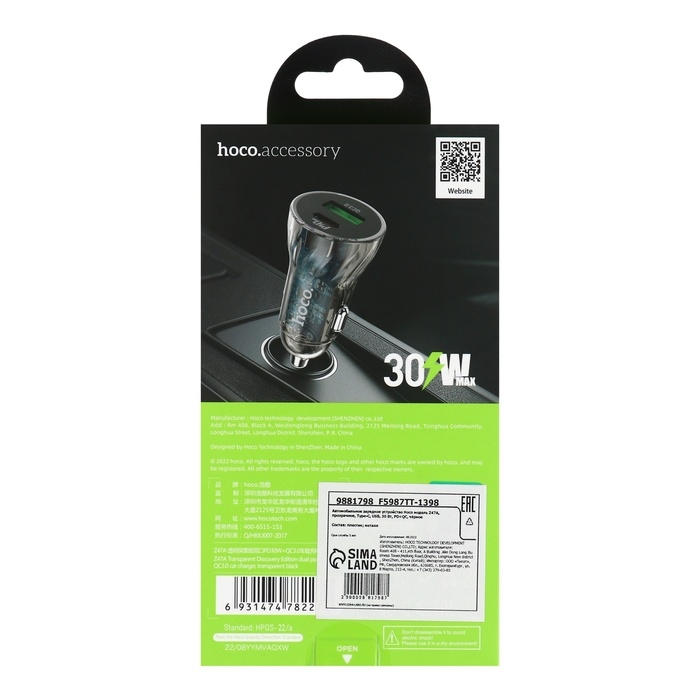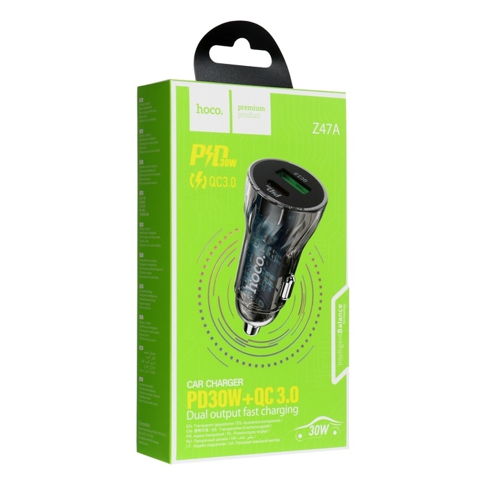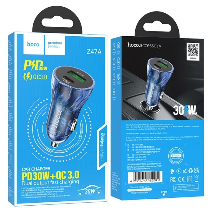 Автомобильное зарядное устройство Hoco Z47A, прозрачное, Type-C, USB, 30 Вт, PD+QC, синий
