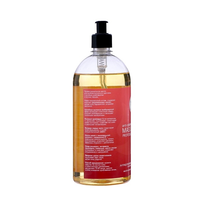 Профессиональное масло для антицеллюлитного массажа с розовым грейпфрутом и жгучим перцем. Имеет натуральный состав, содержит комплекс растительных масел, делает кожу бархатистой, устраняет целлюлит. Целебная вытяжка тамбуканской грязи активирует клеточный обмен, ускоряет регенерацию и насыщает полезными минералами. Розовый грейпфрут богат витамином С, увлажняет, подтягивает, стимулирует синтез коллагена, осветляет тон кожи