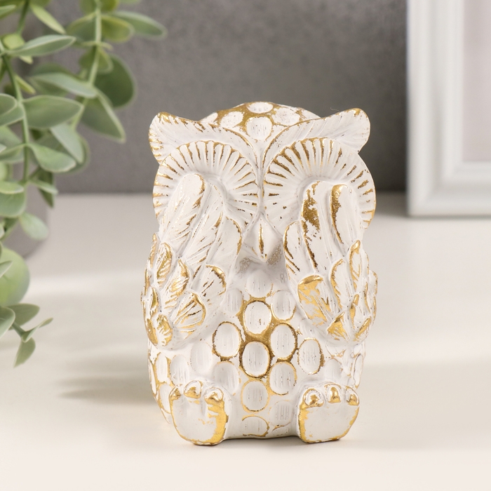 Сувенир полистоун "Совёнок - игра в прятки" белый с золотой патиной 6,5х7х9 см