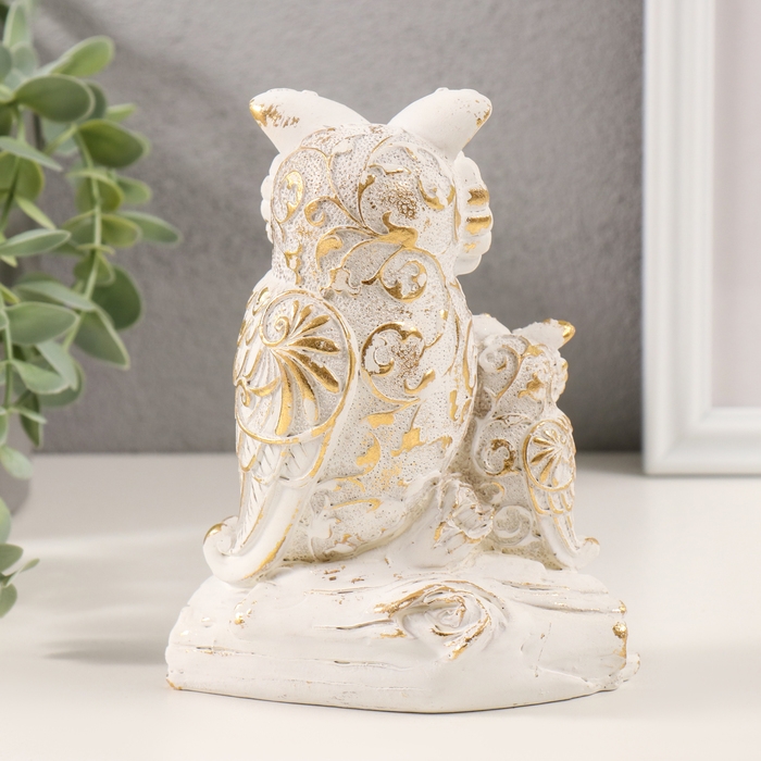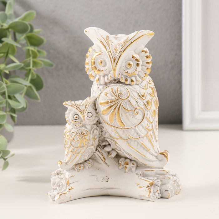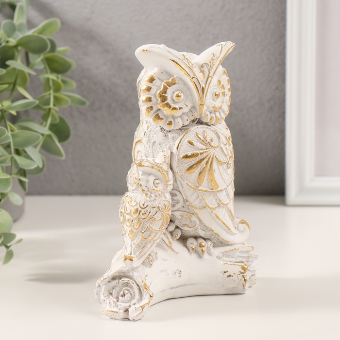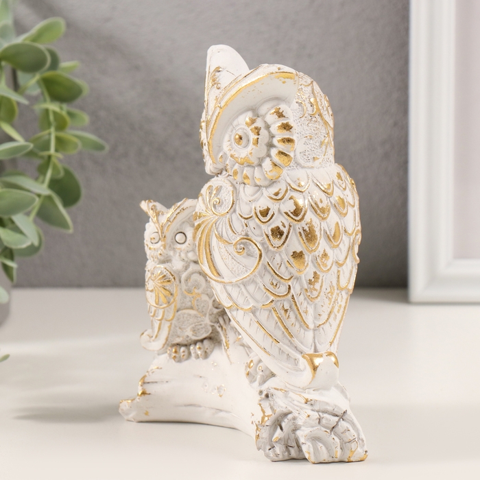 Сувенир полистоун "Сова с совёнком на коряге" белый с золотой патиной 11,5х6,5х14,5 см