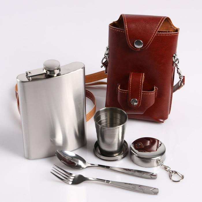 Набор 4 в 1: фляжка 9 oz + ложка + вилка + рюмка 100 мл, в чехле, коричневая кожа