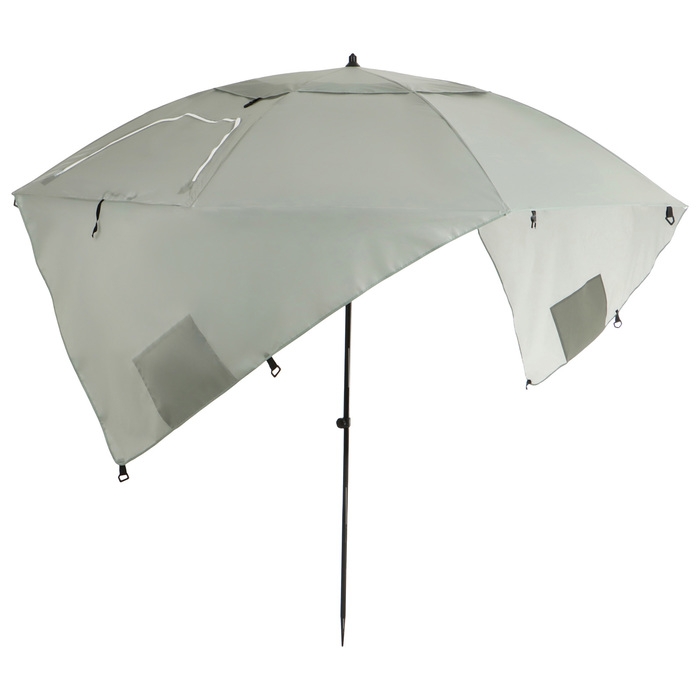 - В комплект входят колышки и верёвка для надёжной фиксации зонта в ветреную погоду, а также чехол для хранения и транспортировки.