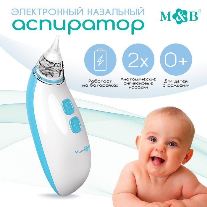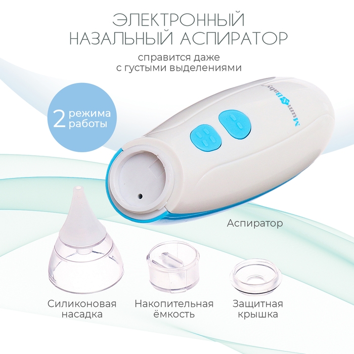 Детский назальный аспиратор, 2 насадки, электрический: 2 режима работы, на батарейках