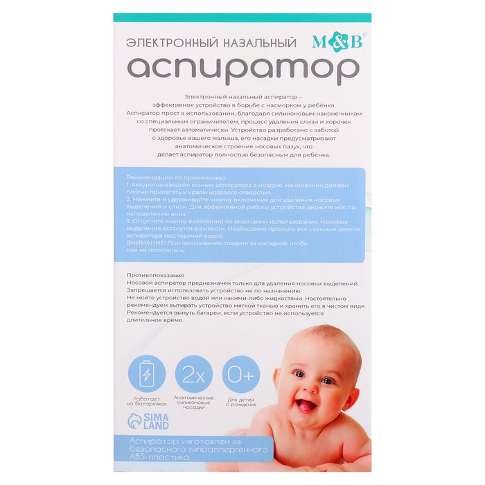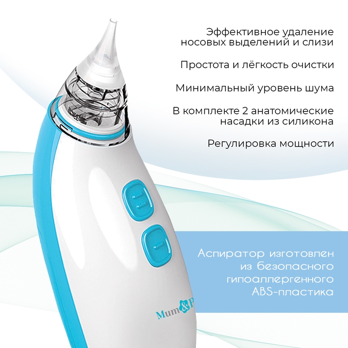 - 2 мягкие силиконовые насадки — безопасны и нежны для чувствительного носа малыша