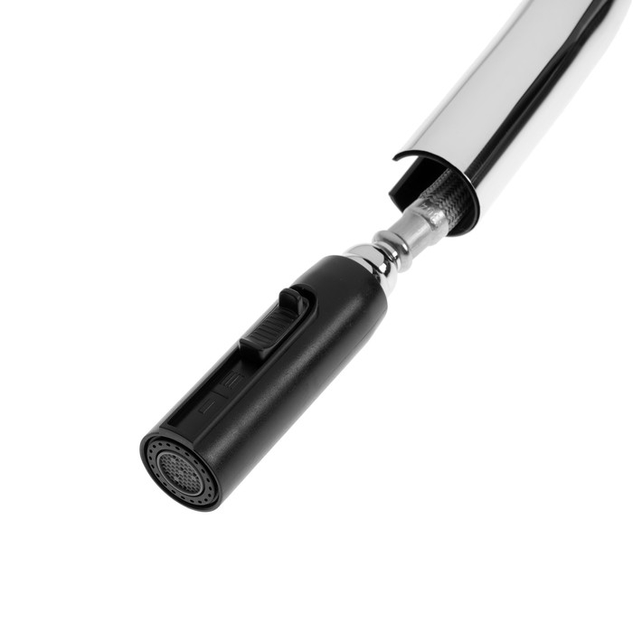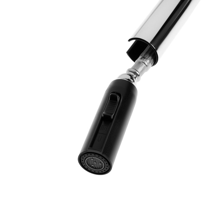 Вытяжной излив добавит функциональности смесителю - можно вымыть объемную посуду, дотянуться до труднодоступных мест и любого содержимого мойки. Также, аэратор имеет два режима подачи воды.