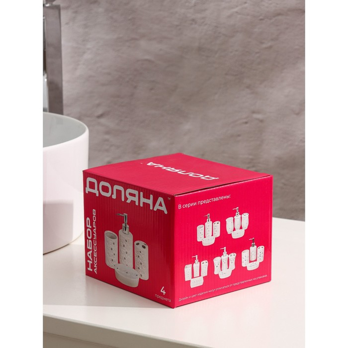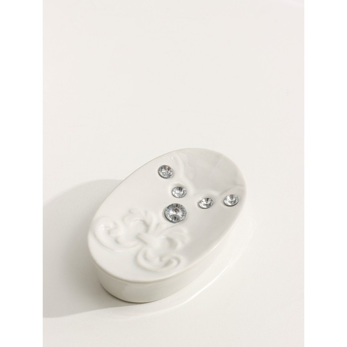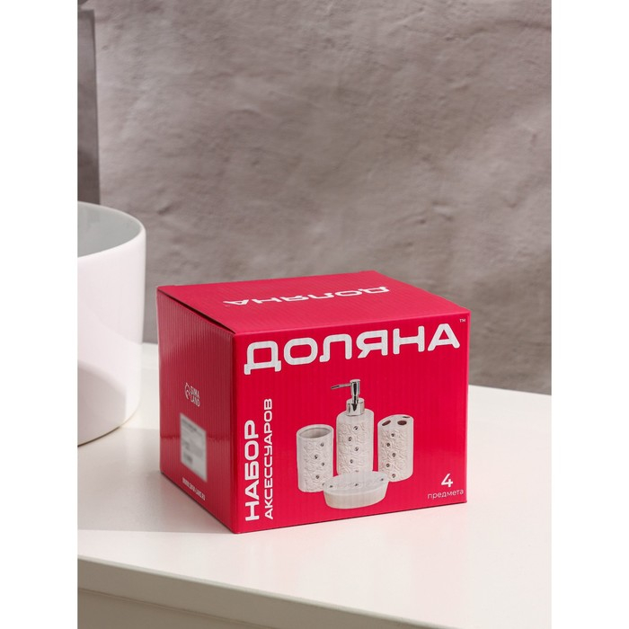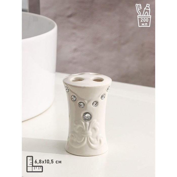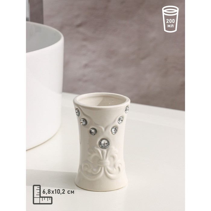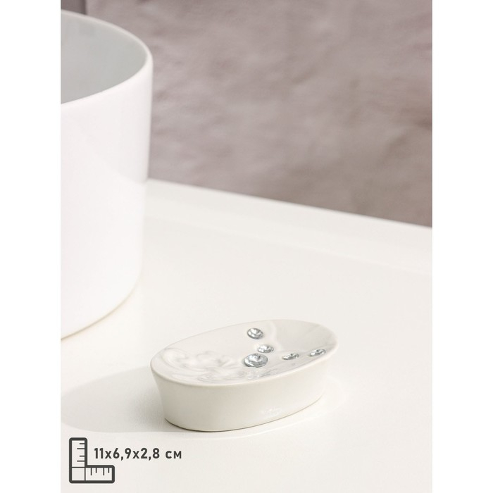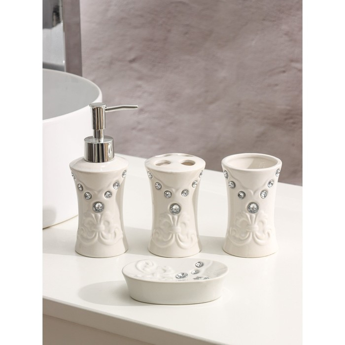 Набор аксессуаров для ванной комнаты Доляна «Стразы. Капельки», 4 предмета (дозатор 200 мл, мыльница, 2 стакана), цвет белый