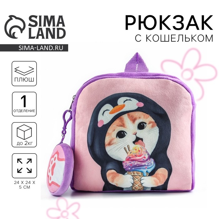 Рюкзак детский плюшевый с кошельком "Котик с мороженкой", 24*24 см, цвет сиреневый