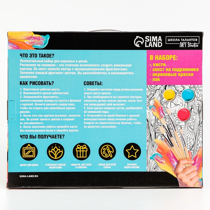Картина по номерам - это холст, который разделён на множество мелких фрагментов, на каждом из которых указано число, соответствующее цвету, которым нужно закрасить данный участок. Простота и удобство в использовании делают этот набор идеальным выбором для всех, кто хочет попробовать себя в живописи.